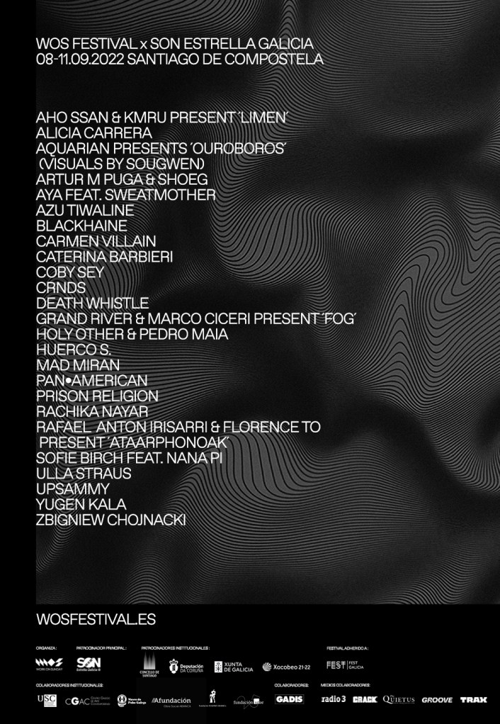 Péchase así o programa desta edición de WOS Festival, organizado pola produtora compostelá WORK ON SUNDAY. O evento conta co apoio estratéxico de SON Estrella Galicia vinculando unha vez máis o seu nome como patrocinador principal e co apoio institucional do Concello de Santiago de Compostela, a Deputación Provincial de A Coruña, a Xunta de Galicia a través de Xacobeo 21-22 e AGADIC, ademais de outras institucións e axentes culturais que operan na cidade. Tanto os abonos como as entradas de día e actividades puntais xa están á venda e pódense adquirir a través de https://wosfestival.es.