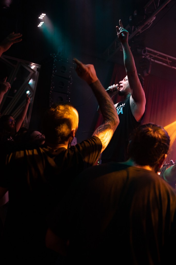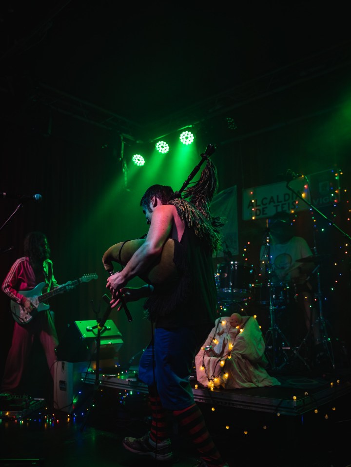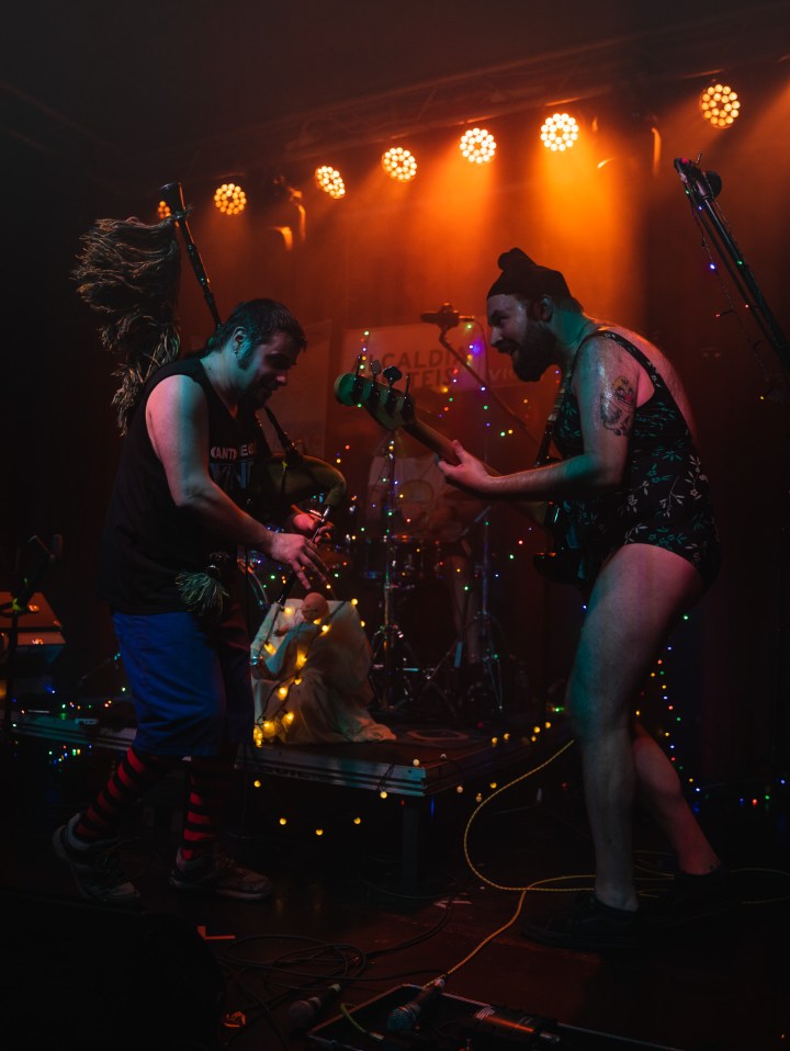 E ao ser un concerto de Nadal (xa que o Nadal en Vigo, como sabedes, comeza como moi tarde en novembro) non podían faltar as panxoliñas. Houbo varias ao longo do concerto, comezando con “Os peixes do lagares”, unha adaptación dunha panxoliña mítica que o grupo sacou xa alá polo 2012. Seguiron esta canción con nada menos ca unha versión dos Tamara, a navideña “Os anxeliños d’o ceo” (sinxelo de 1967). Porén, axiña volveron os temas propios, cun dos que máis soaron do novo álbum e que tamén leva anos sendo ben coñecido polos seguidores do grupo: “A canto está o rapante?”. Con este tema, os asistentes xa entraron definitivamente en calor, e comezaron os pogos. E falamos de calor figuradamente, porque en sentido literal, dende logo, fixo moito calor dentro da sala durante todo o concerto. Agora xa directamente comezaría fluír a súor a borbotóns tanto enriba como debaixo do escenario, como debe ser. Sinal dun bo concerto!