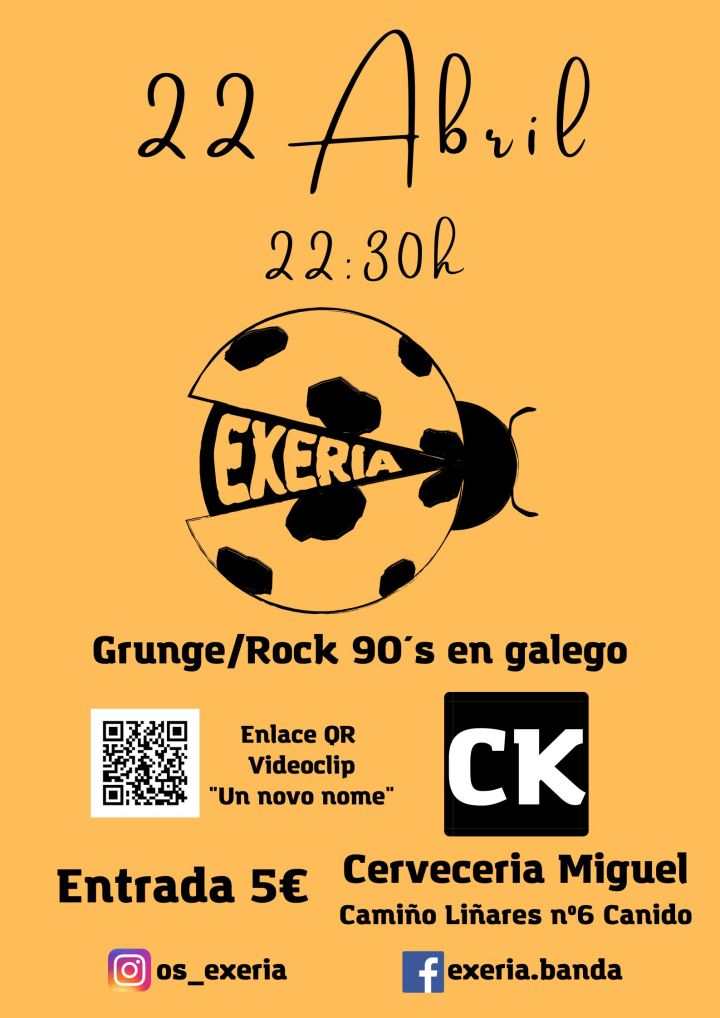 Este vindeiro sábado 22, a banda de rock alternativo Exeria estará na Cervecería Miguel en Canido, onde continuarán a presentar o seu novo sinxelo “Un novo nome”. Este tema, lanzado o pasado mes, reflicte a súa mestura de influencias do rock dos anos 90, de movementos tales como o grunge, o britpop ou o stoner. Os membros da banda, procedentes da comarca do Condado, proveñen de bandas como O Caimán do Rio Tea, Cool Funeral, Circular ou Met.