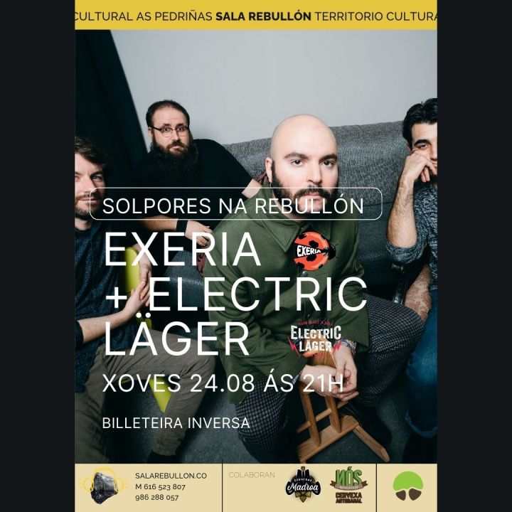 Exeria é unha banda de rock en galego de Ponteareas formada no ano 2021. O pasado sábado 11 de marzo lanzaron o seu primeiro sinxelo, “Un novo nome”, acompañado dun videoclip dirixido por Wences Lamas, e agora, explican, están “a piques de pecharse no estudio a rexistrar novos temas”. Porén, antes desta reclusión voluntaria, haberá dúas ocasións máis de desfrutar no seu directo, ambas na comarca de Vigo. A primeira destas ocasións terá entrada de balde, no chiringuito O Pirata de Samil, ubicado en primeira liña de mar na parroquia viguesa de Navia. Será o vindeiro mércores 23 de agosto ás 21:00. A segunda, como parte do ciclo de concertos Solpores na Rebullón, terá lugar no exterior da sala homónima ubicada na parroquia mosense de Tameiga, o xoves 24, tamén ás 21:00. Nesta última estarán acompañados doutra banda galega, Electric Läger, e a entrada será con billeteira inversa, puidendo cada asistente decidir a contía da súa aportación.