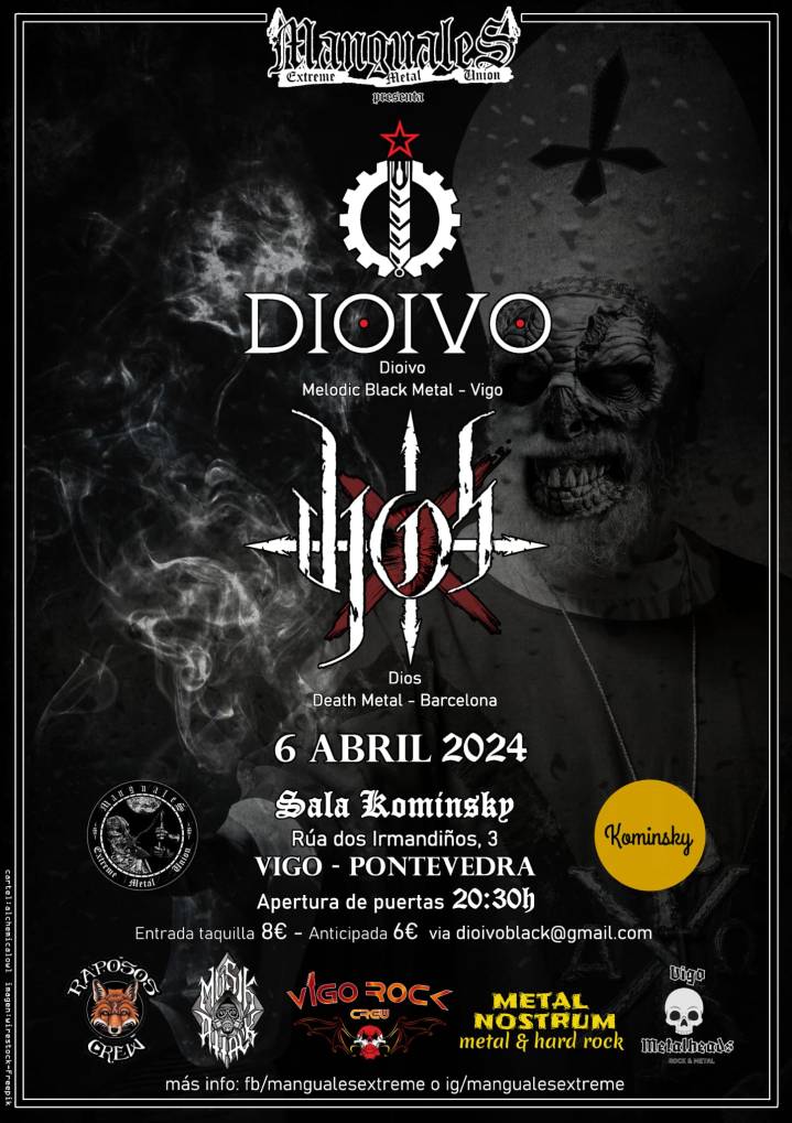 O dúo de metal en galego Dioivo dará un novo concerto na súa cidade natal, Vigo, acompañado esta vez da banda barcelonesa de death metal Dios. O evento terá lugar na céntrica sala Kominsky o sábado día 6 de abril, durante a fin de semana na que se celebra a Reconquista de Vigo. A apertura de portas será ás 20:30, e as entradas poderán ser reservadas de xeito anticipado a un prezo de 6€ contactando con Dioivo a través das súas redes sociais. Na billeteira tamén haberá entradas dispoñibles, esta vez a un prezo de 8€.