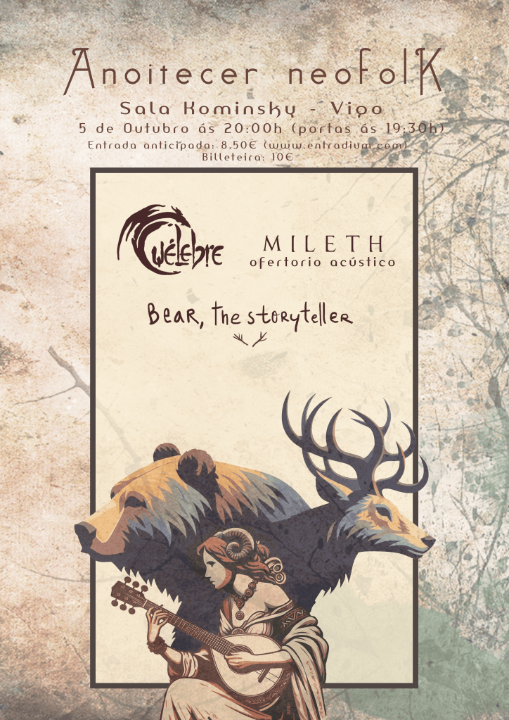 O día 5 de outubro terá lugar en Vigo un concerto que, baixo o nome de Anoitecer Neofolk, reunirá na Sala Kominsky a tres proxectos musicais de diferentes puntos do estado: Mileth, Cuélebre e Bear, The Storyteller. O evento comezará ás 19:30, e a entrada terá un prezo de 8,50€ anticipada e de 10€ na billeteira. Tratarase dun concerto acústico no que as tres bandas ofrecerán as súas particulares aproximacións á música de raiz, especialmente dende o prisma do neofolk, un subxénero moi vencellado á escena metal e punk dende o seu nacemento nos anos oitenta do século pasado.