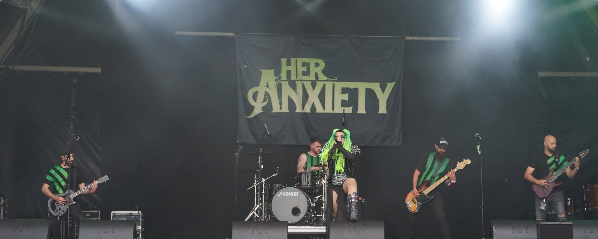 Un chisquiño antes das 13:50, que marcaban exactamente a metade dos dous concertos, emprendimos o traxecto cara o Desert Stage para ver a Her Anxiety, a gañadora do concurso de bandas do festival. O quinteto desenvolvera unha boa campaña propagandística para que a xente acudise ao seu bolo; e a iso hai que sumar que a súa vocalista, Aida Anxiety, é un rostro coñecido nos últimos anos no festival polas súas chamativas indumentarias tanto como asistente como, agora, enriba do escenario.