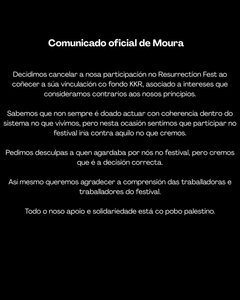 O comunicado de Moura, formación coruñesa que practica unha mestura de rock psicodélico e progresivo con folk e música tradicional, foi publicado o pasado día 23 de maio nas súas redes sociais. Nel sinálase que os seus membros decidiron cancelar a súa participación no Resurrection, no que estaban confirmados dende que saíu o primeiro cartel como parte do escenario Desert, ao coñecer a súa vinculación con KKR. Este fondo, subliñan, está asociado a intereses contrarios aos seus principios. Rematan o texto amosando a súa solidariedade e apoio ao pobo palestino, recibindo miles de interaccións positivas en redes.