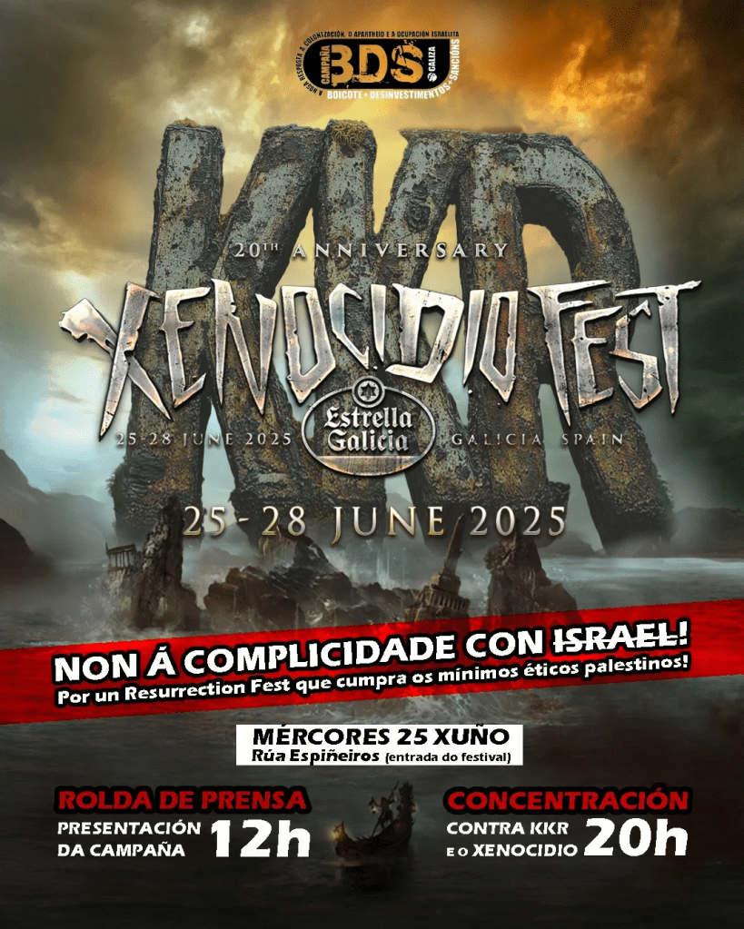 Durante a celebración do Resurrection Fest 2025 en Viveiro, BDS concentrarase cada día ás portas do recinto para reclamarlle ao festival que cumpra cos mínimos éticos esixibles fronte ao xenocidio en Palestina. O movemento iniciou o pasado 8 de maio unha campaña para visibilizar que o evento foi, xunto a outras decenas de festivais estatais e europeos, adquirido polo fondo de investimento proisraelí KKR. Este participa activamente de diversos xeitos na operación de limpeza étnica que está a levar a cabo o Estado sionista, tal e como publicaron as compañeiras e compañeiros do medio El Salto.